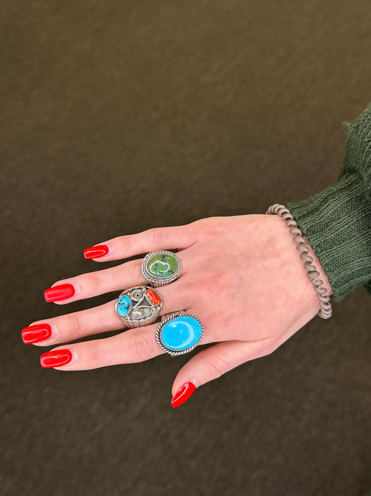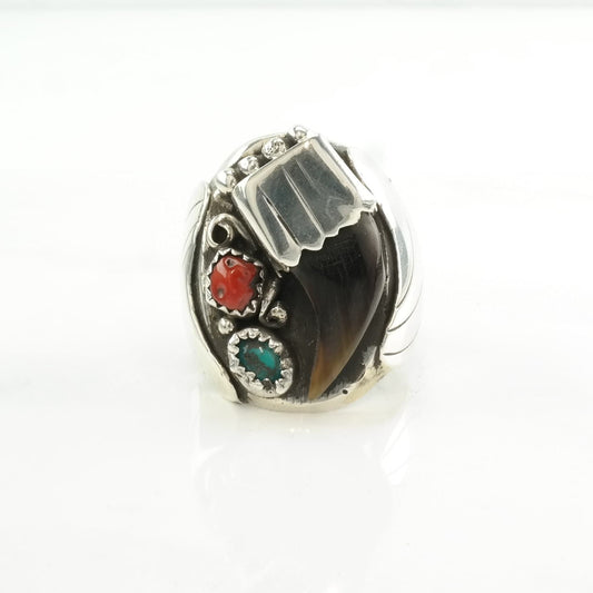 Vintage Native American Silver Ring Turquoise, Coral, Coyote Claw Leaf Sterling Blue, Red Size 11 1/2