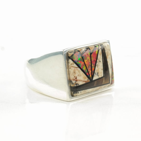 Vintage Sterling Silver Multi Gemstone Inlay Ring, Size 11 1/2, Southwestern Jewelry, Signed Ferris, Lab Opal and Natural Stones