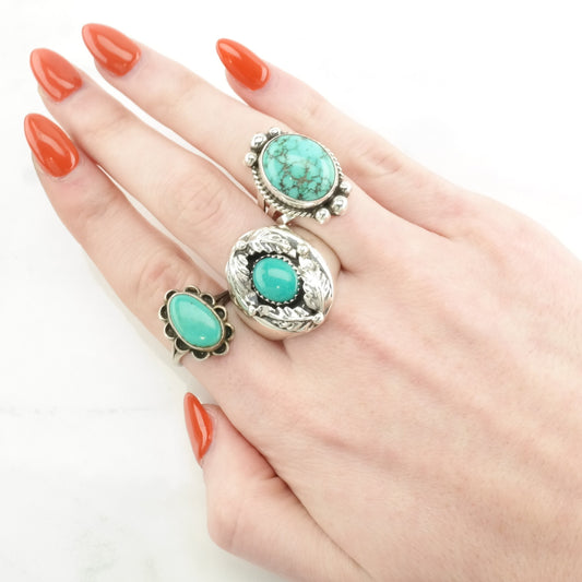 Vintage Native American Sterling Silver Green Turquoise Ring, Size 11, 1970s Southwestern Jewelry, Statement Ring