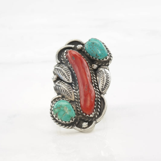 Vintage Native American Ring Coral, Turquoise Feather Sterling Silver Size 4