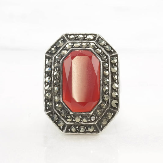 Vintage Art Deco Silver Ring Carnelian, Marcasite Sterling Red Size 4 3/4