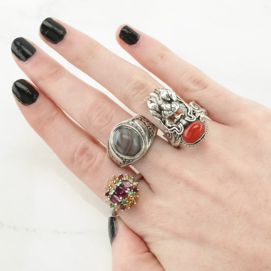 Vintage Chinese Export Silver Ring Coral Dragon Sterling Red Size 6 3/4