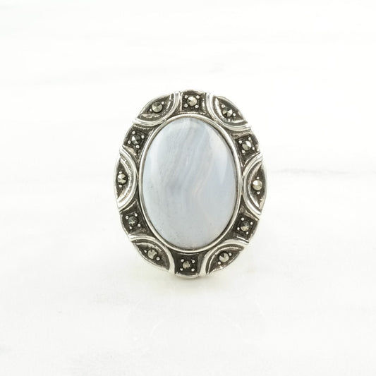 Vintage Sterling Silver Ring Lace Agate Marcasite Purple Size 6 3/4