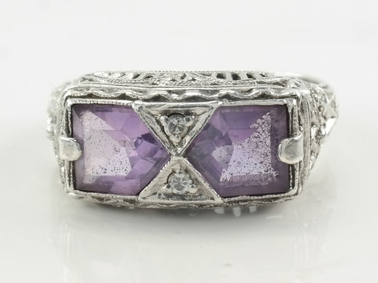 Vintage Sterling Silver Ring Double Amethyst, Gemstone, Floral, Filigree Size 6 3/4