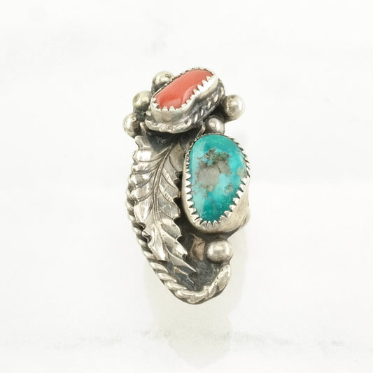Vintage Native American Silver Ring Turquoise, Coral Leaf Sterling Blue, Red Size 6 3/4