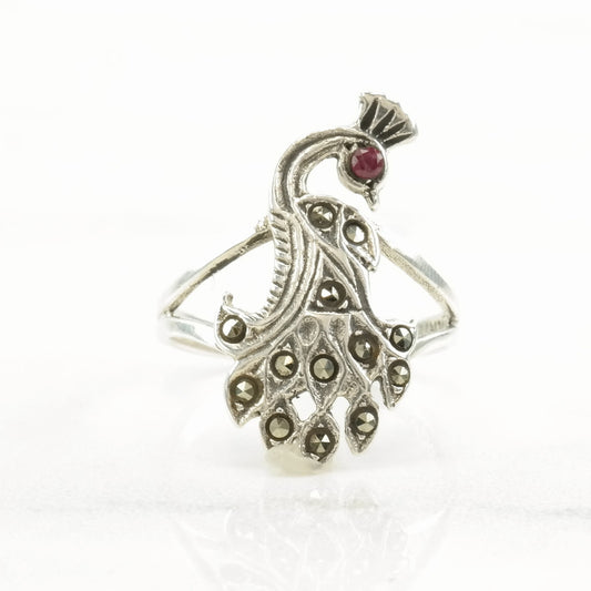 Vintage Art Deco Silver Ring Ruby, Marcasite Peacock Sterling Size 6