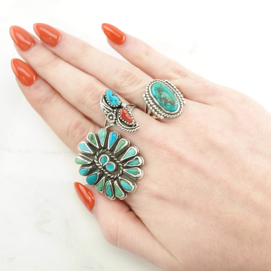 Vintage Native American Silver Ring Turquoise, Coral Floral Sterling Blue, Red Size 6 1/4