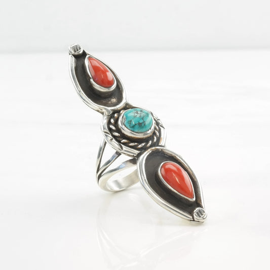 Vintage Native American Sterling Silver Ring, Coral & Turquoise, Size 6, 1970s Southwestern Jewelry, Shadowbox Ring