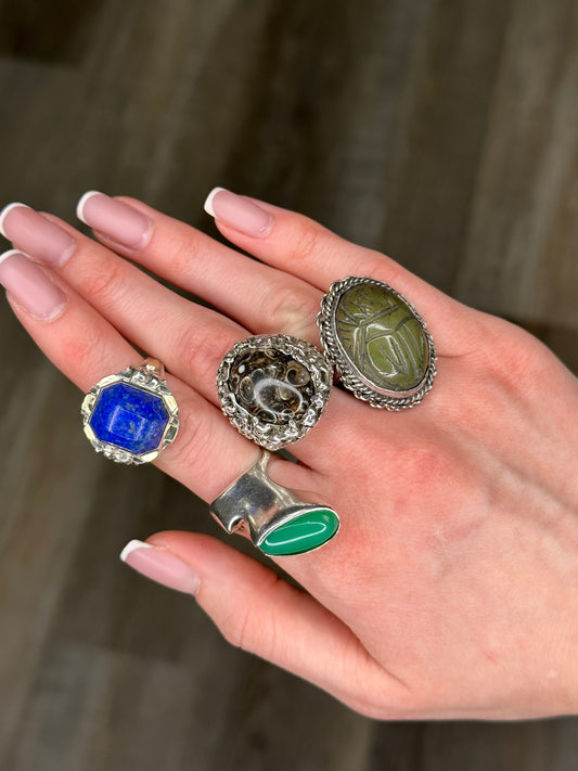 Vintage Mexico Silver Ring Carved Scarab Onyx Sterling Size 7 1/2