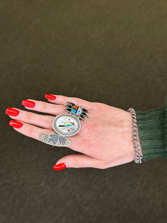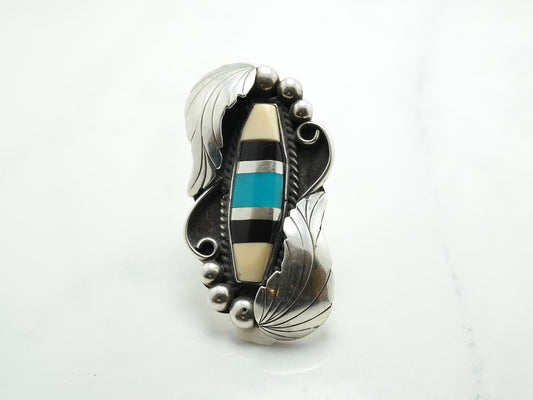 Vintage Native American Silver Ring Coral Turquoise MOP Onyx Inlay Sun Sterling Size 7 1/2