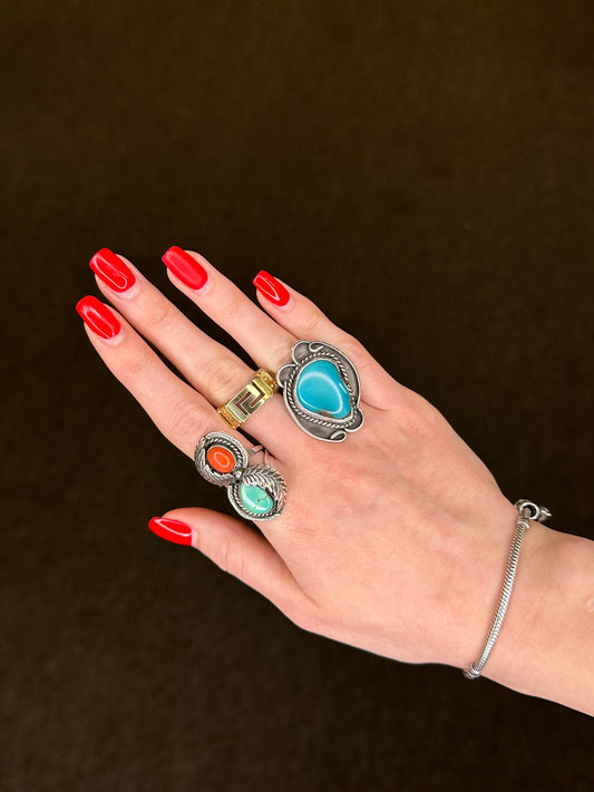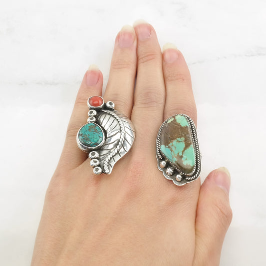 Vintage Native American Silver Ring Turquoise Coral Leaf Double Sterling Size 7 3/4