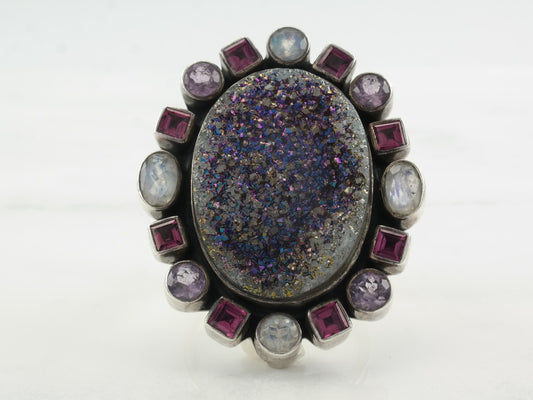 Vintage Nicky Butler Ring Druzy, Amethyst, Moonstone, Garnet Sterling Silver Size 7 3/4