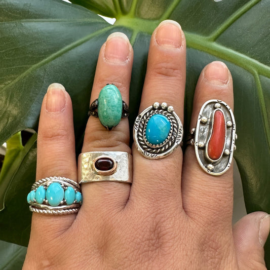 Vintage Native American Ring Turquoise, Coral Feather Sterling Silver Size 7 3/4
