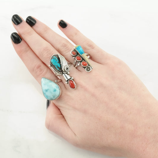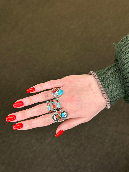 Vintage Native American Silver Ring Turquoise Coral Onyx Triple Stack Inlay Sterling Size 7 3/4