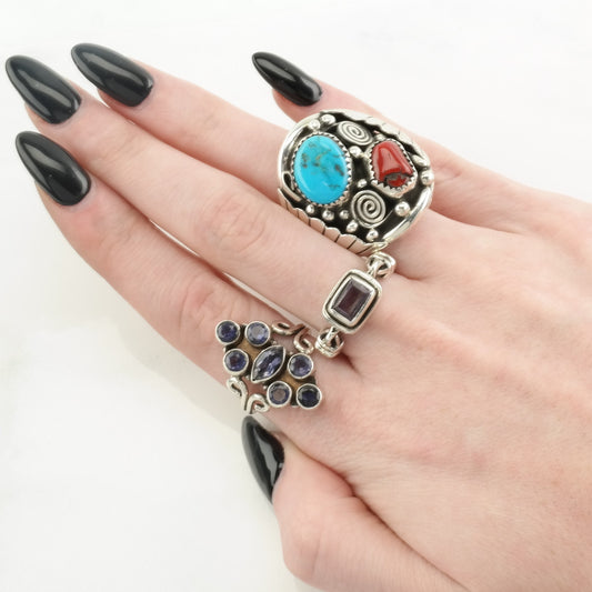 Native American Silver Ring Turquoise, Jet, MOP Inlay, Bluejay Sterling Size 7