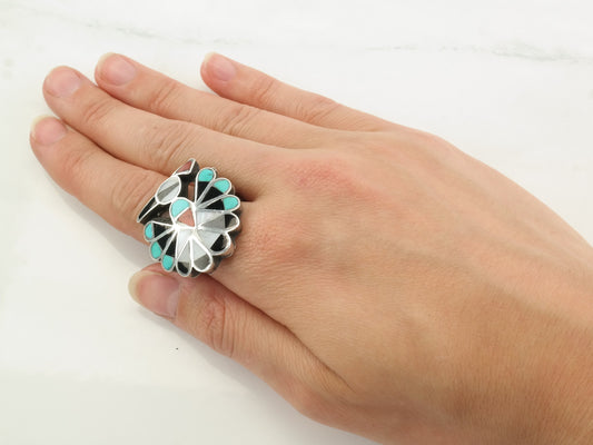 Vintage Native American Silver Ring Peyote Inlay, Bird Sterling Size 8 3/4