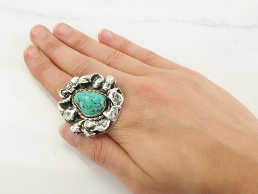 Vintage Southwest Silver Ring Turquoise Brutalist Style Sterling Size 8 1/2