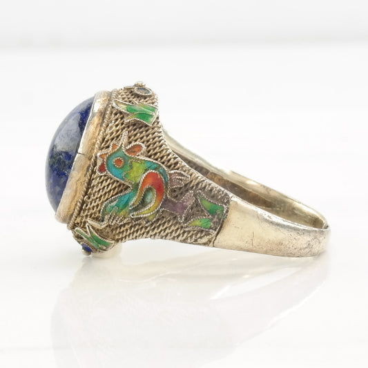 Antique Chinese Ring Lapis Lazuli Enamel, Chicken, Filigree Sterling Silver Size 9 - 9 1/2
