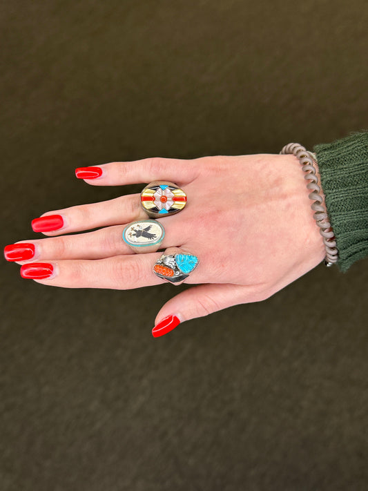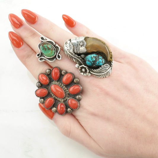 Vintage Loyolita Tsattie Zuni Silver Ring Turquoise Coral Carved Leaf Sterling Size 9 1/4