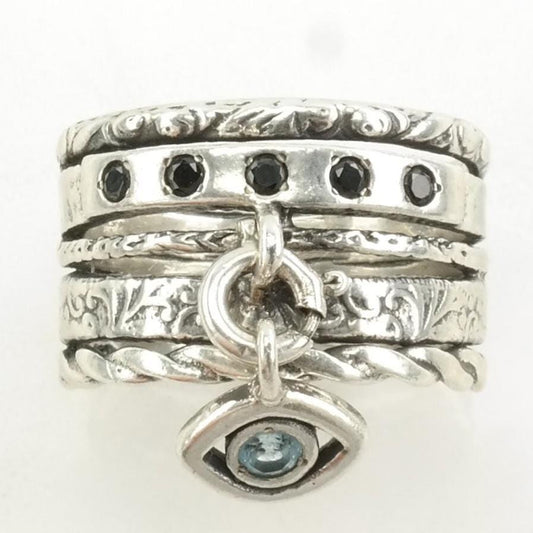 Vintage Israel Silver Ring Topaz, Evil Eye Removeable Hanging Charm Sterling Blue Size 9 1/4