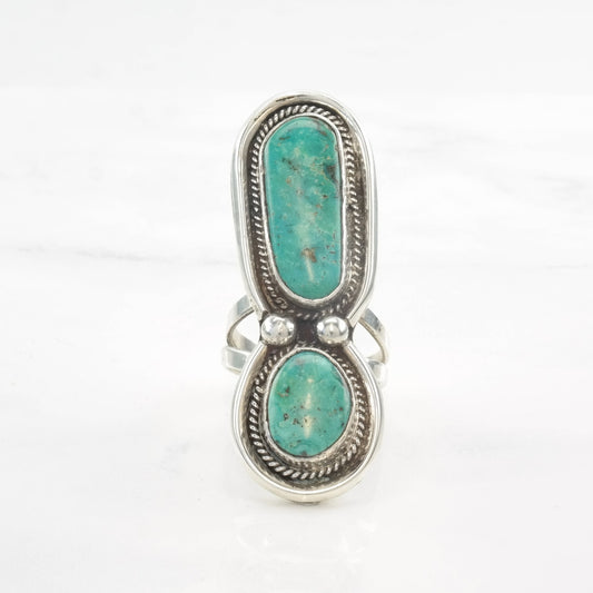 Vintage Native American Ring Two Stone, Turquoise Exclamation Point Sterling Silver Size 9