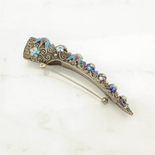 Antique Chinese Sterling Silver Brooch Enamel, Filigree Turquoise, Coral, Nail B1863