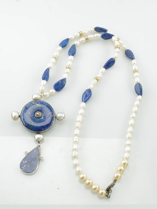 Vintage Sterling Silver White Blue FW Pearl Lapis Lazuli Gold Color Beads Necklace