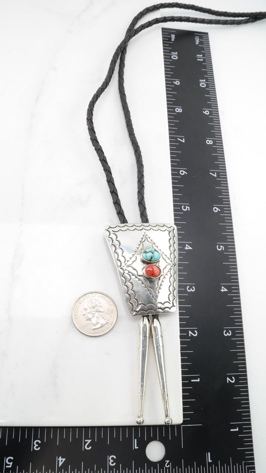Vintage Native American Sterling Silver Blue, Red Turquoise Coral Bolo Tie Necklace