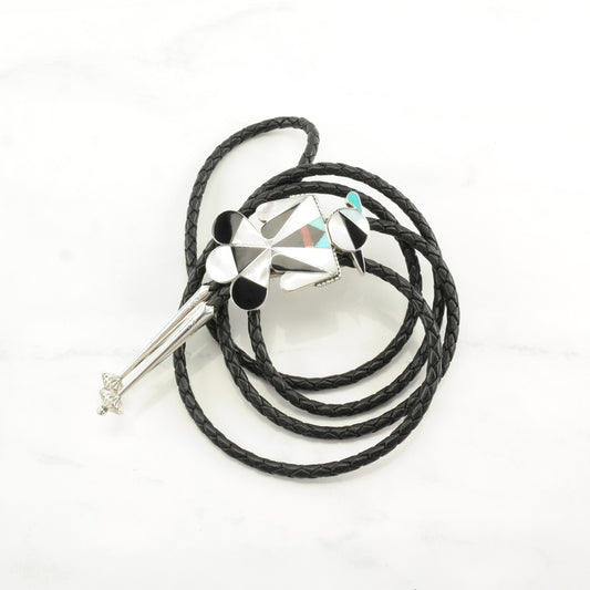 Vintage Native American Sterling Silver MOP, Onyx, Turquoise, Coral Bird, Inlay Bolo Tie