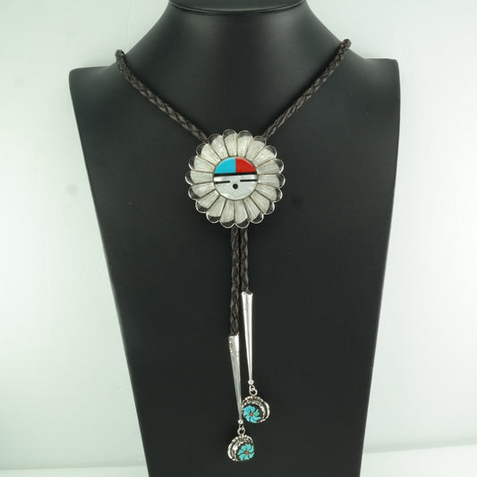 Zuni Calavaza Inlay Bolo Tie Figure Sterling Silver Turquoise Coral Necklace