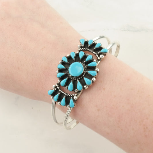 Vintage Native American Sterling Silver Cuff Bracelet Blue Turquoise, Petit Point Floral