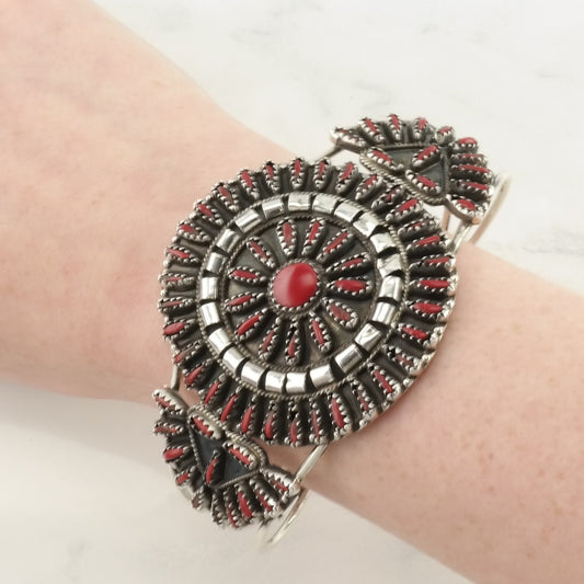 Vintage Southwest Sterling Silver Cuff Bracelet Red Created Coral Needlepoint, Floral