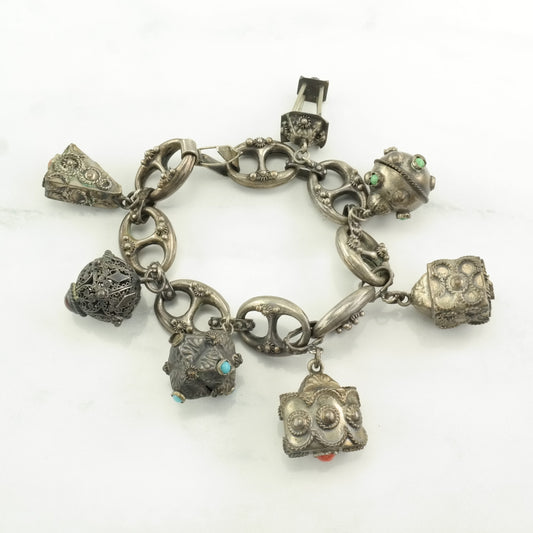 Etruscan Revival Sterling Silver Charm Bracelet Faux Turquoise, Coral, Carnelian