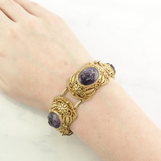 Chinese, Export Sterling Silver Link Bracelet Gold Gilded, Purple Amethyst, Carved, Flower Gold Gilded, Filigree