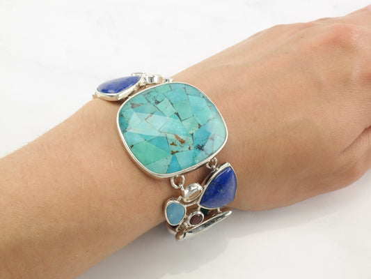 Modernist Sterling Silver Line Bracelet Multi Stone, Turquoise, Lapis Lazuli, Opal