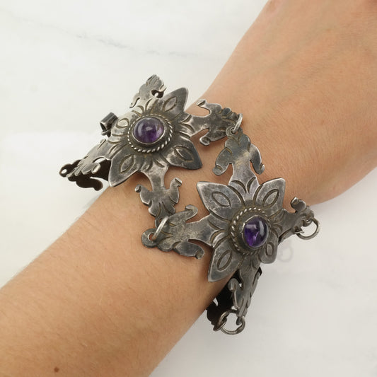 Pre Eagle, Taxco Sterling Silver Link Bracelet Purple Amethyst Floral