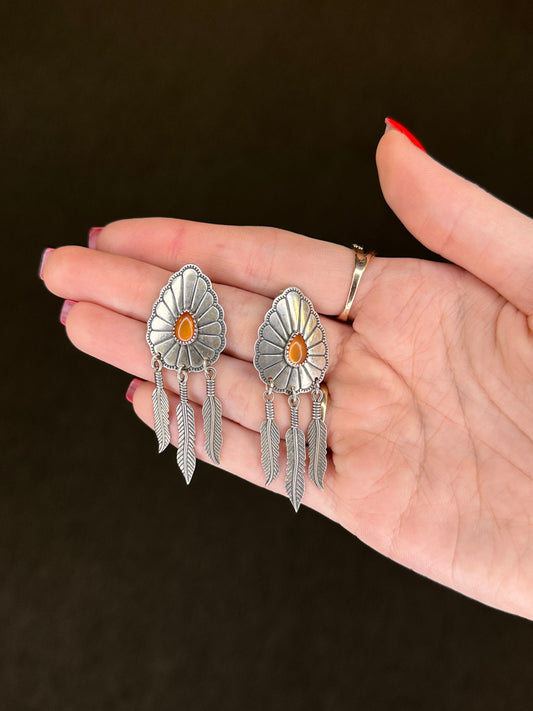 Native American Sterling Silver Amber MOP Doublet Concho Navajo Earrings Stud Dangle