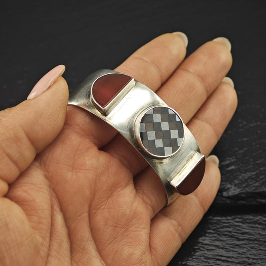 GFMW Mid Century Silver Cuff Bracelet Carnelian Checkered Sterling