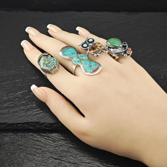Large Turquoise, Coral Inlay Ring Sterling Silver Sz 8