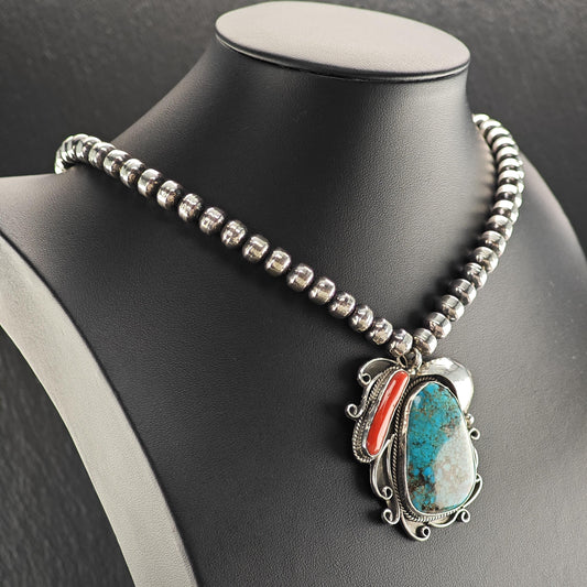 Native American Turquoise, Coral Beaded Necklace in Sterling Silver