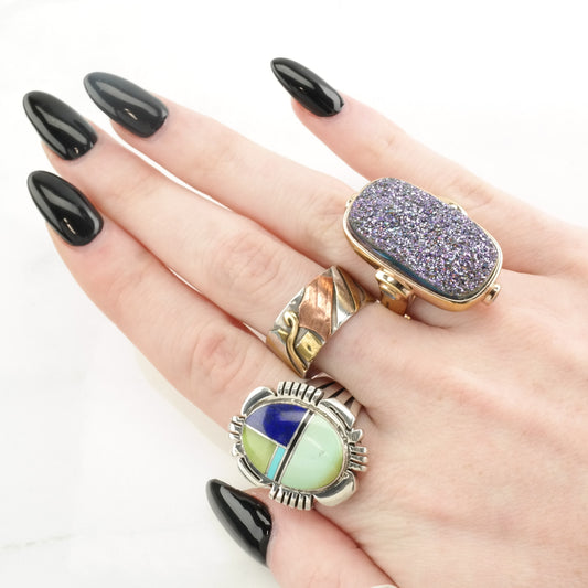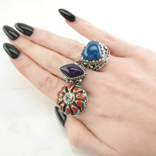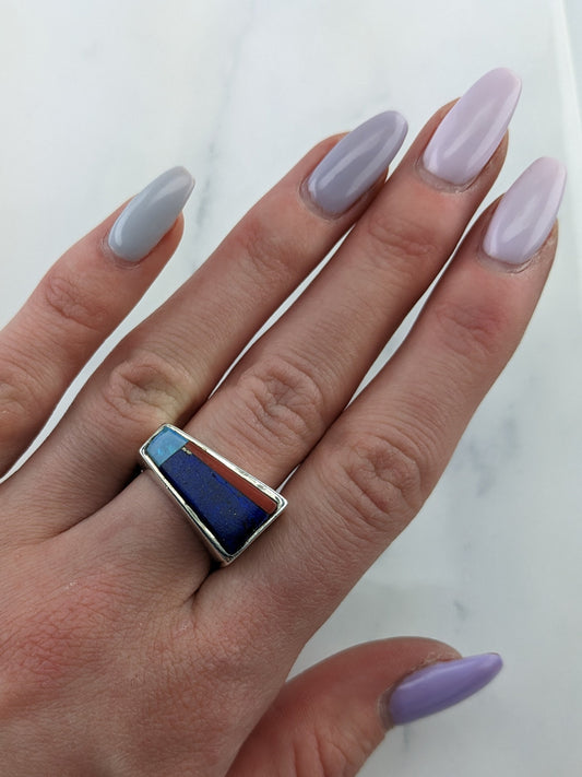 Vintage Native American Silver Ring Lapis Coral Opal Inlay Sterling Multicolor Size 8 1/4