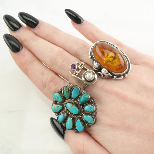 Vintage Statement Sterling Silver Ring Size 8 Turquoise Natural Sapphires