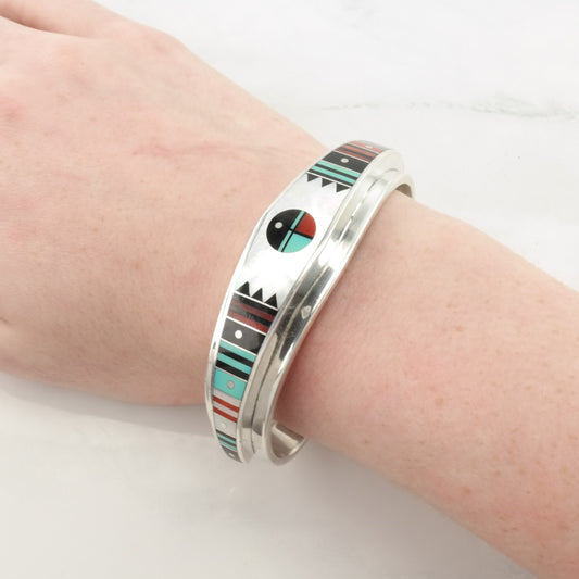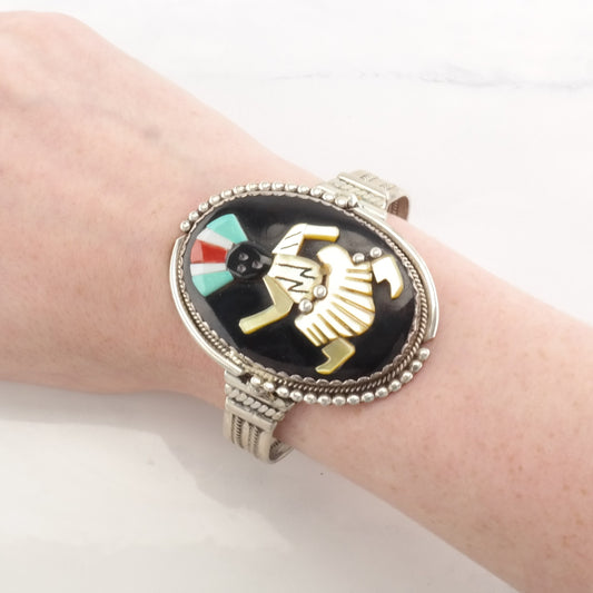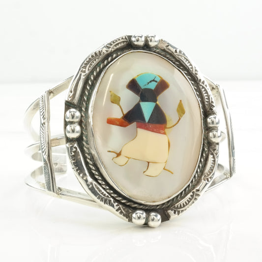 Vintage Sterling Silver Cuff Bracelet, Kachina Inlay, Mother of Pearl, Turquoise, Coral, Onyx, Southwestern Jewelry