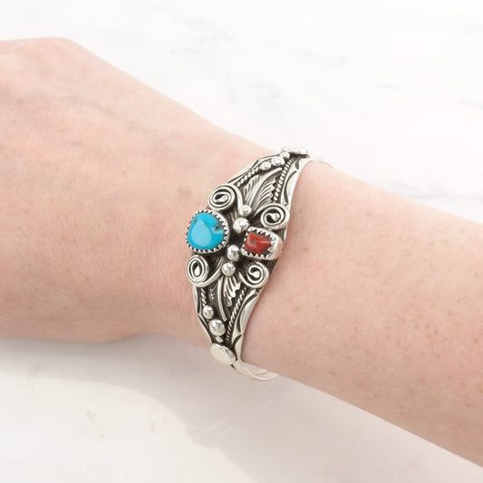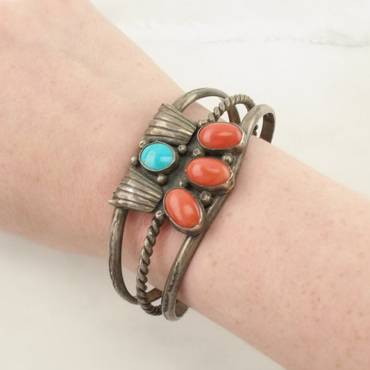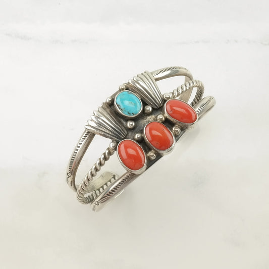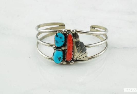 Native American Silver Cuff Bracelet Sterling Turquoise Coral