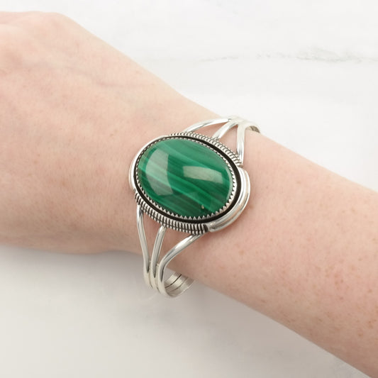 Vintage Native American Sterling Silver Cuff Bracelet Green Malachite