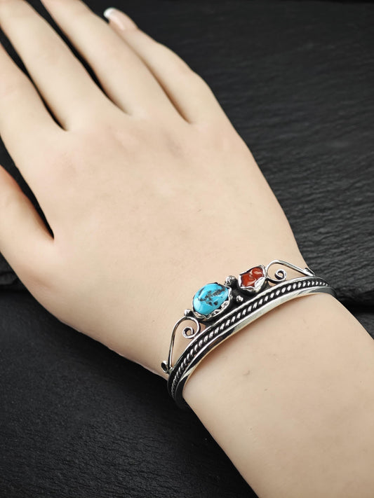 Navajo, Native American Turquoise, Coral Cuff Bracelet Sterling Silver