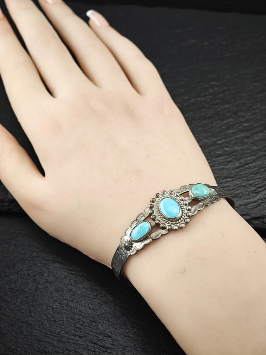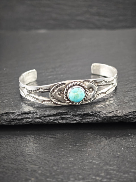 Native American Turquoise, Stamped Cuff Bracelet Sterling Silver