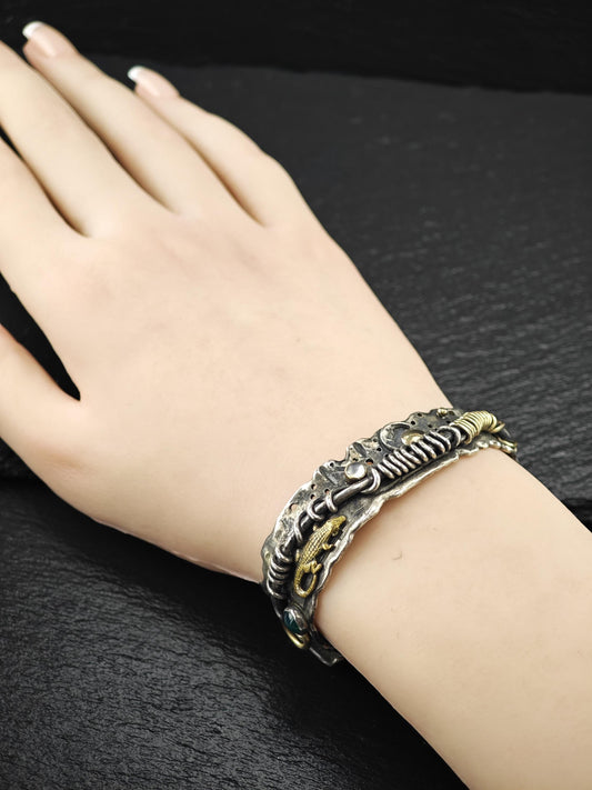 Brutalist Alligator, Moonstone, Onyx 14K Gold Accents Cuff Bracelet Sterling Silver