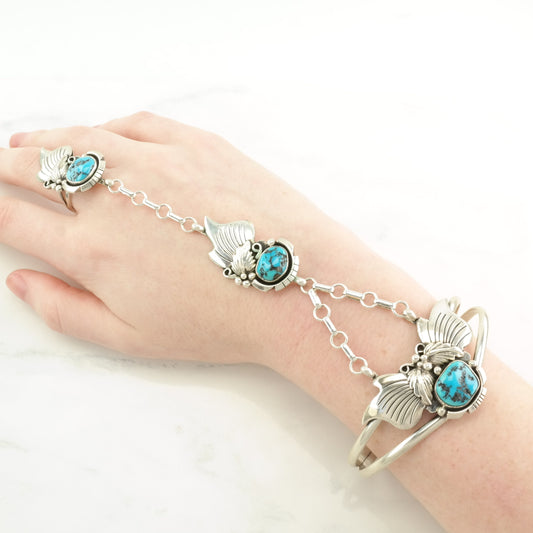 Native American Sterling Silver Cuff Bracelet Ring Combo Blue Turquoise Leaf