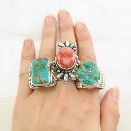 Vintage Navajo Turquoise & Coral Ring, Sterling Silver, Leaf Design, Size 7 1/4, Circa 1970s